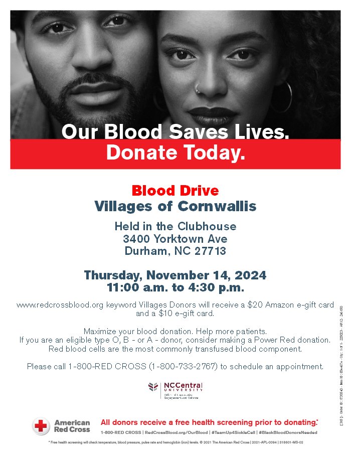 To Participate: Register using the link: www.redcrossblood.org, keyword: Villages. Donors will receive a $20 Amazon e-gift card and a $10 e-gift card. Walk-ins are allowed.