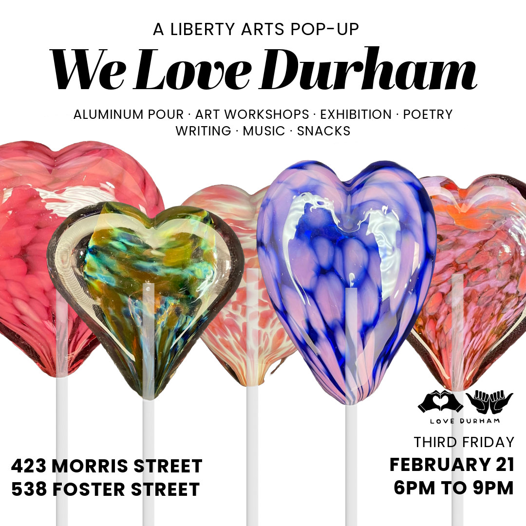 Join Liberty Arts for a night of artmaking, poetry, hearts and beats in Durham Central Park! Everyone is invited to celebrate creativity, community and connection. Let’s find out how much we heart Durham through love in art!