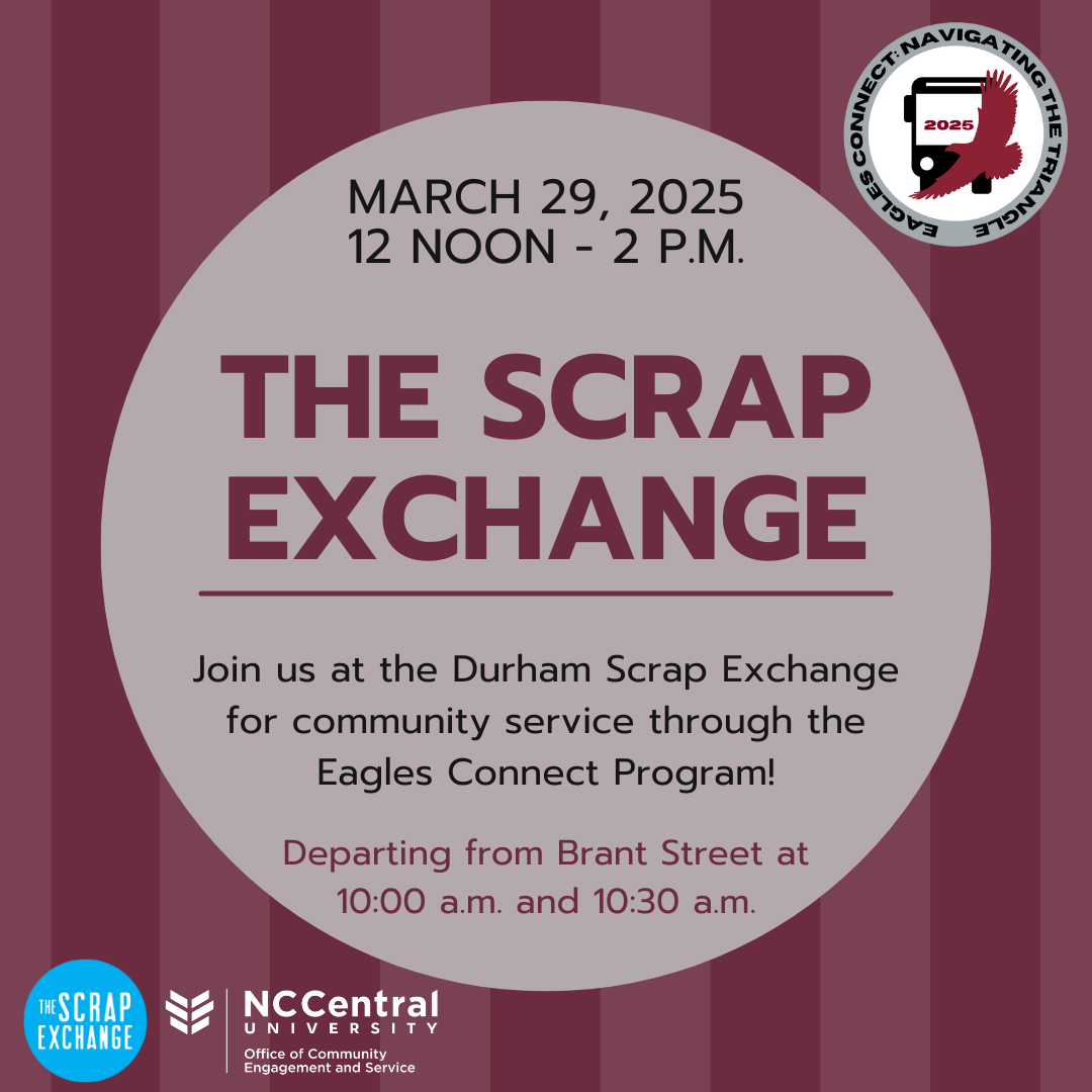 Travel with the Eagle Connect Navigators from NCCU to downtown Durham and transfer to your community partner location to serve with the Scrap Exchange.