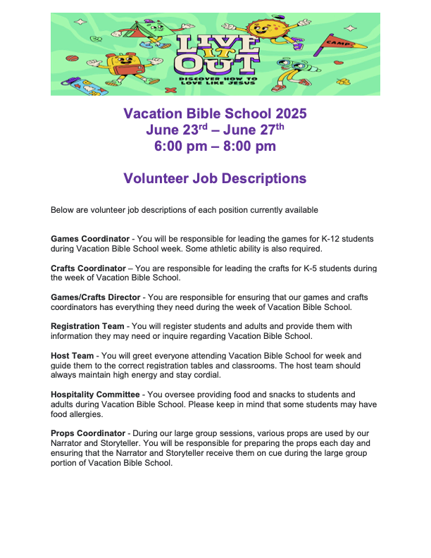 Hello!! This is an announcement for those who are interested in participating in our vacation bible school program this summer. You'll have the opportunity to share your talents while also creating a community with your local church. If you don't belong to a church, that's fine. At Peace, we welcome you with open arms and this will be the perfect opportunity to meet new people and create connections. If you're interested in this program for the week, please apply by June 13, 2025. Those who are open to participating will have someone reach out to them to schedule a meeting before vacation bible school starts.