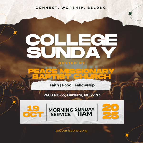 Peace Missionary Baptist Church in Durham invites you to College Sunday on Sunday, October 19.
