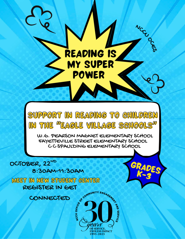 In the spirit of the 2025 Ultimate Homecoming Experience, the Office of Community Engagement and Service at NCCU, along with Durham Public Schools, seeks your support in reading to children in grades K-3 in "Eagle Village Schools" surrounding the University.