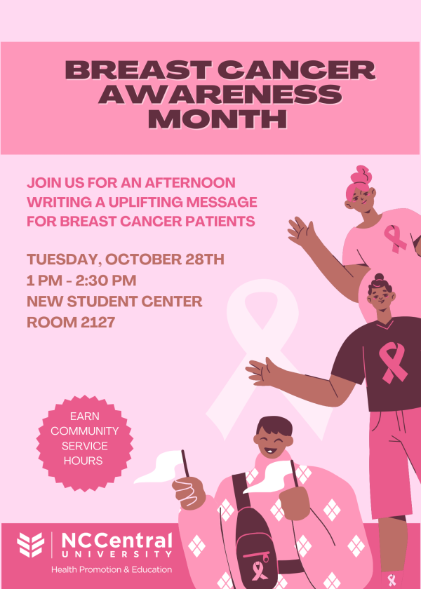 Close out this month by writing an encouraging message for breast cancer patients. This event is at New Student Center, room 2127, on Tuesday, October 28th, from 1-2:30 pm.
