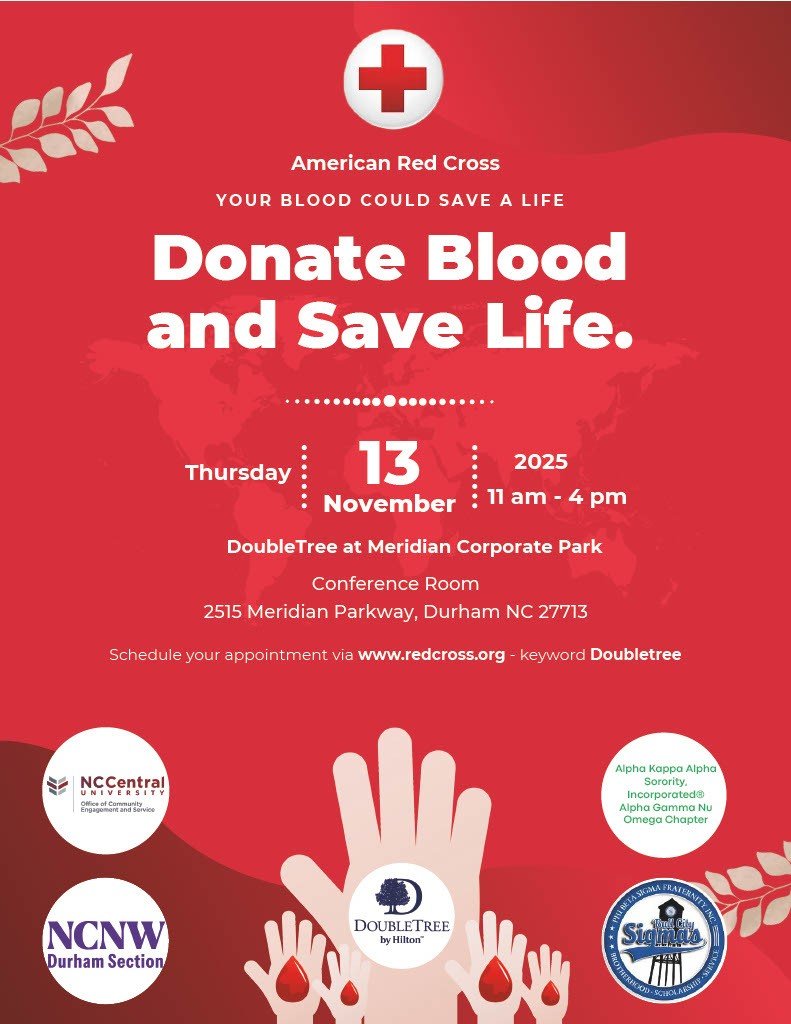 Please join us November 13, from 11 am-4 pm at the DoubleTree Hotel at Meridian Corporate Park Conference Room , located at 2515 Meridian Parkway, Durham, NC 27713 to donate blood and save lives. Please go to www.redcross.org, keyword Doubletree to schedule a life-changing appointment.