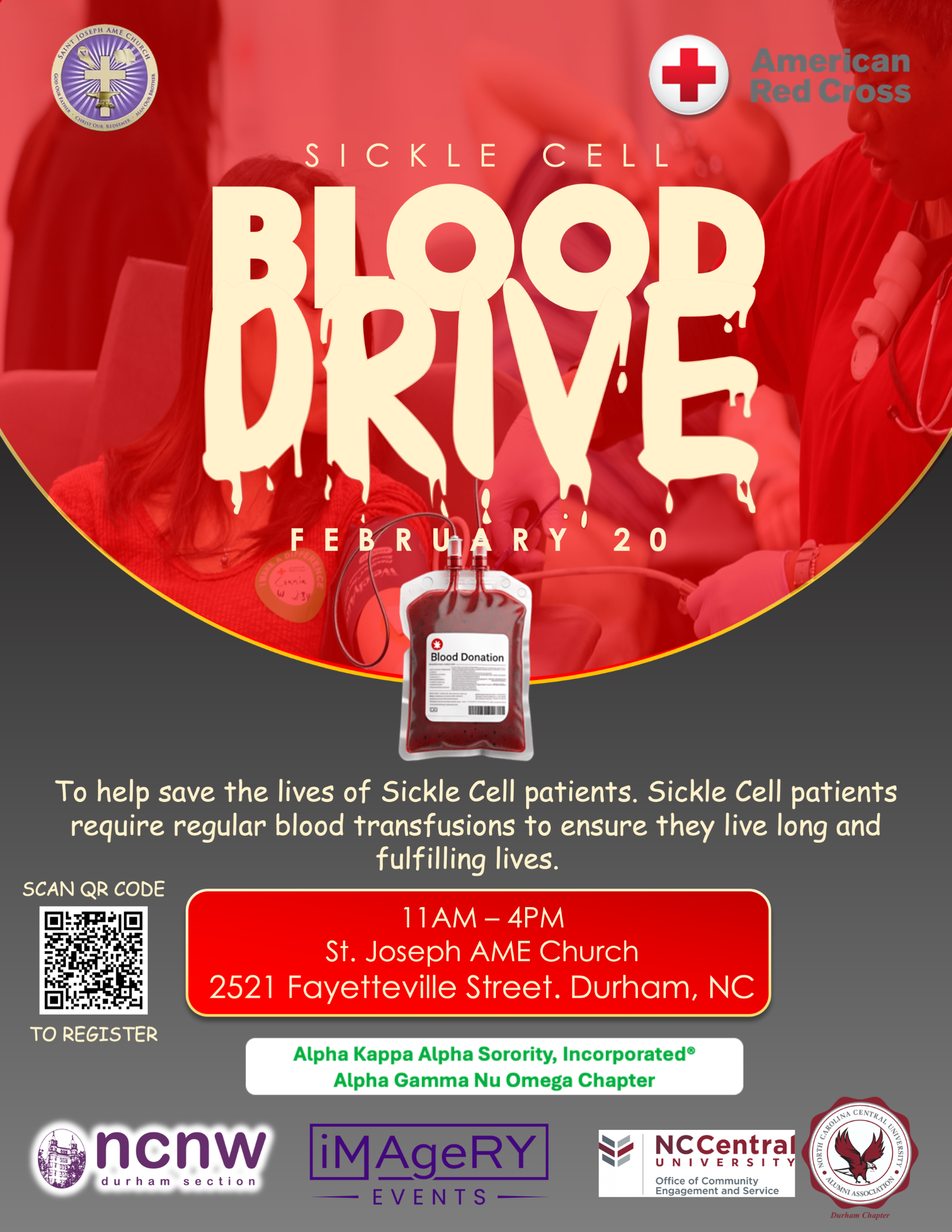 We invite you to join the American Heart Association, the American Red Cross, North Carolina Central University, and our gracious host, St. Joseph AME Church, on February 20, 2026, from 11:00 a.m. to 4:00 p.m. for this meaningful and life-saving effort.