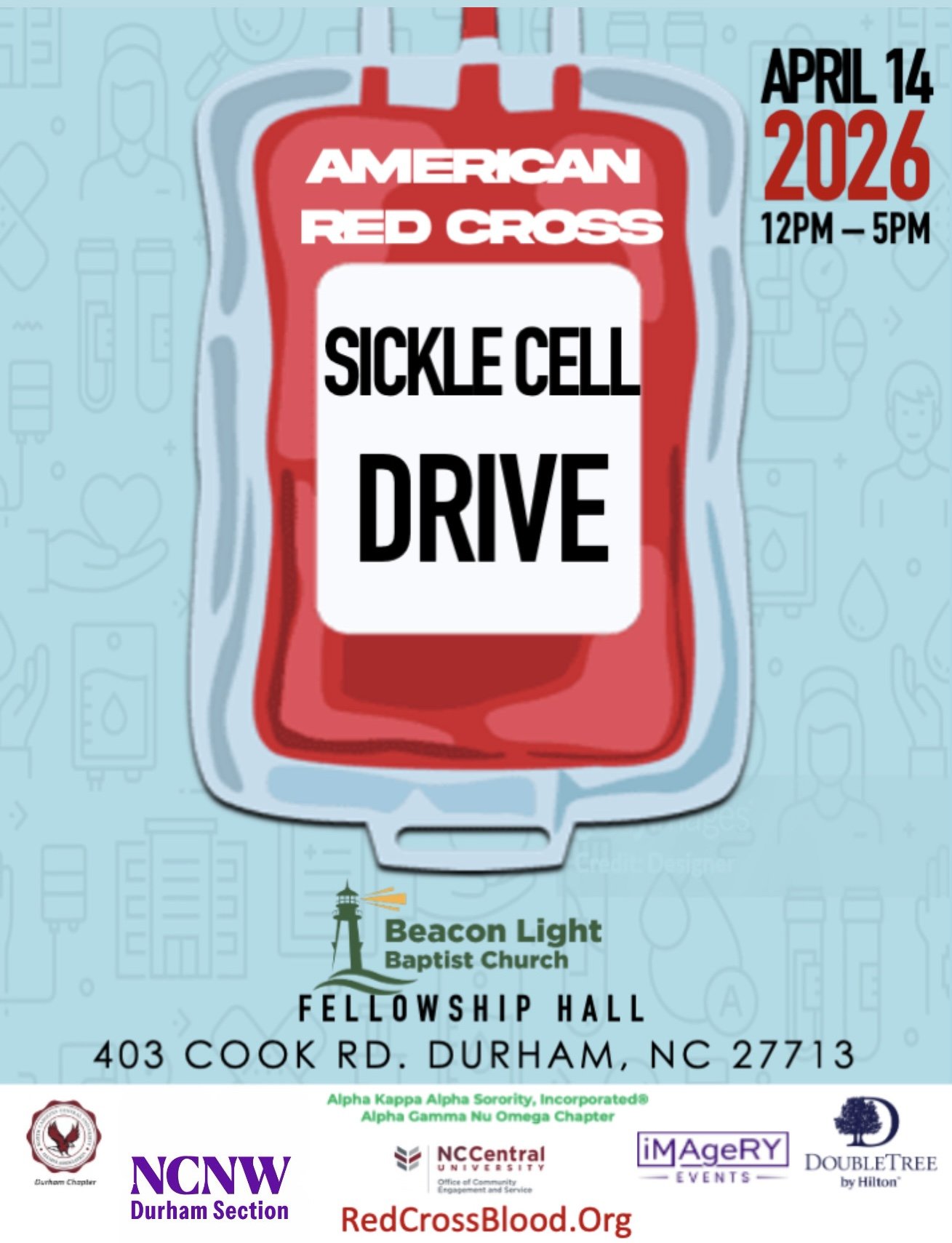 We invite you to join the American Red Cross, North Carolina Central University, and our gracious host, Beacon Light Baptist Church, on April 14, 2026, from 12:00 p.m. to 5:00 p.m. for this meaningful and life-saving effort.